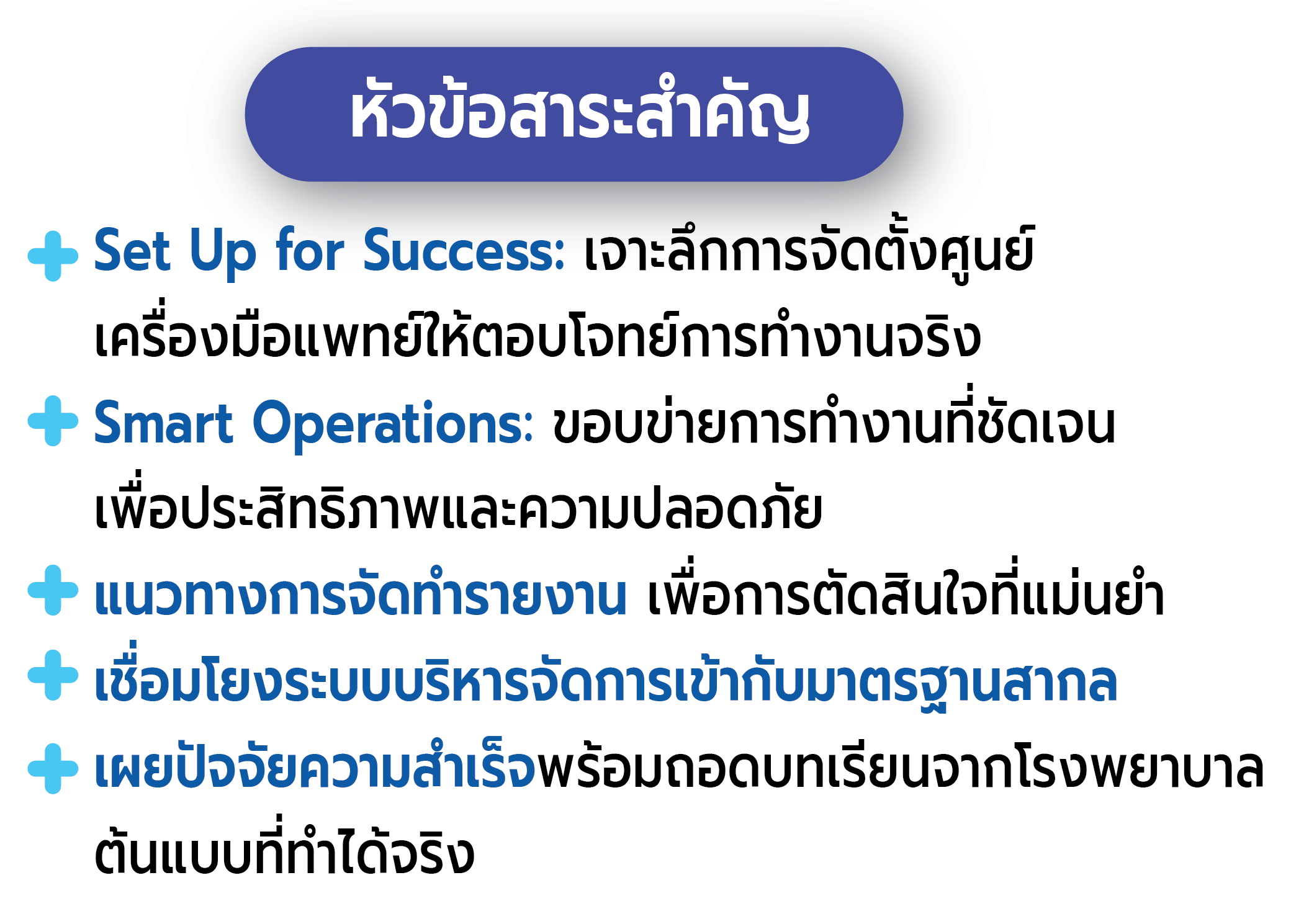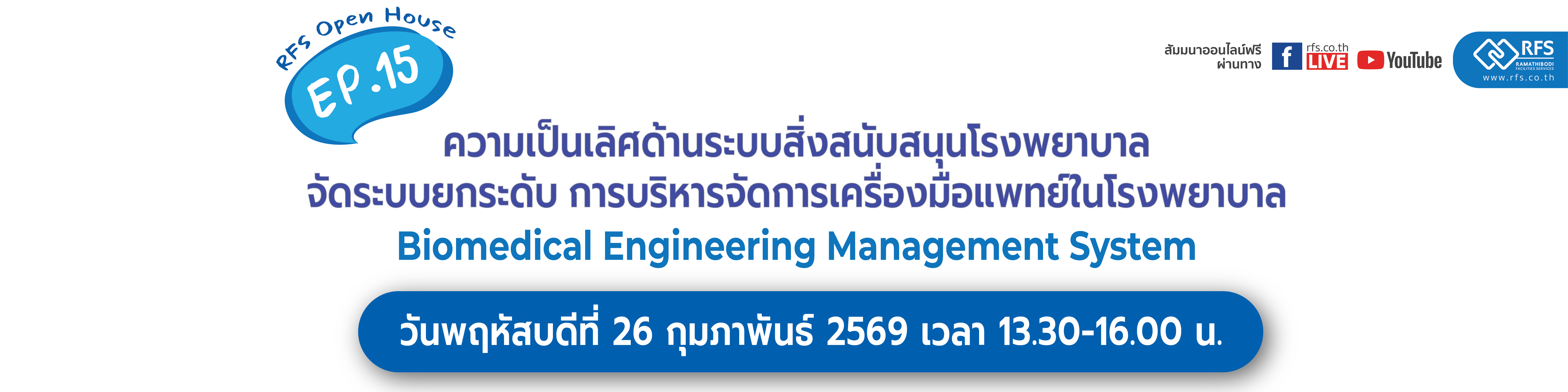 การวางแผนงาน การจัดการระบบ การกำหนดนโยบาย การตรวจสอบติดตาม และกระบวนการอื่นๆ อีกมากมาย ที่เป็นปัจจัยแห่งความสำเร็จของการบริหารจัดการเครื่องมือแพทย์ Episode นี้ บริษัท อาร์เอฟเอส จำกัด พร้อมถอดบทเรียนสำคัญต่างๆ จากประสบการณ์ตรง เพื่อร่วมพัฒนาระบบบริหารจัดการเครื่องมือแพทย์ภายในโรงพยาบาล